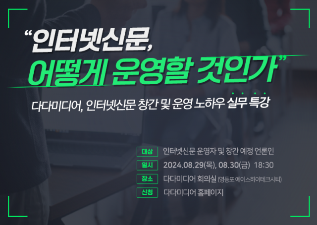 인터넷신문 제작 전문 다다미디어는 오는 8월 29일(목)과 8월 30일(금) 인터넷신문 운영자 및 창간 예정 언론인을 대상으로 ‘인터넷신문, 어떻게 운영할 것인가’라는 주제의 인터넷신문 운영 및 창간 등록 실무 강좌를 개최한다.