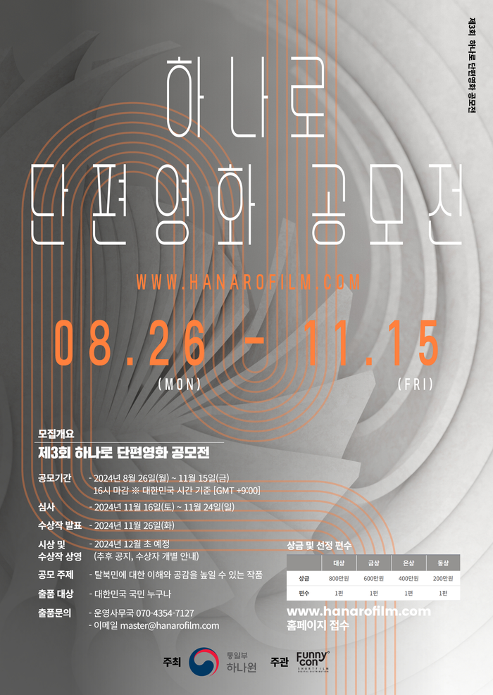 통일부 하나원이 탈북민의 성공적인 정착을 응원하고, 남북 주민간 화합에 기여할 수 있는 분위기를 만들어 나가기 위한 ‘제3회 하나로 단편영화 공모전’을 개최한다.
