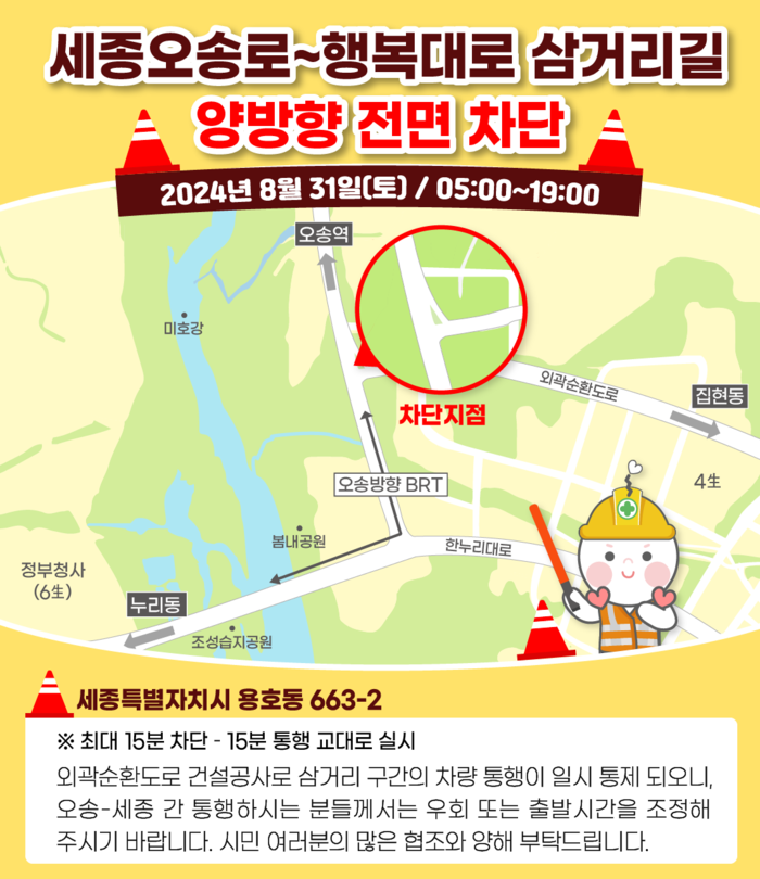 행정중심복합도시건설청이 세종오송로~행복대로 임시 삼거리 구간 양방향이 오는 31일(토) 오전 5시부터 19시까지 15분 간격으로 전면 통제된다고 밝혔다.
