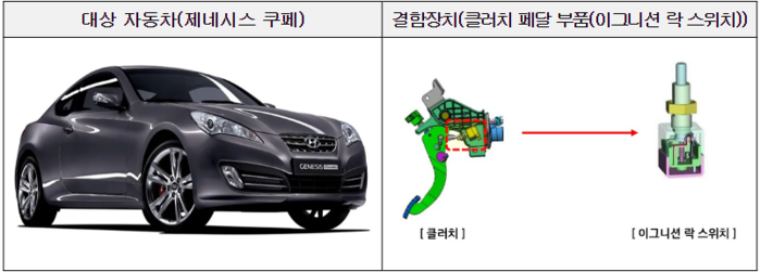 또 현대자동차 제네시스 쿠페 2792대는 클러치 페달 부품의 손상이 있는 경우, 클러치 페달을 밟지 않아도 시동이 걸리고 차량이 움직일 수 있어 안전에 지장을 줄 가능성으로 있다는 판단에 따라 9월 6일부터 시정조치에 들어간다.