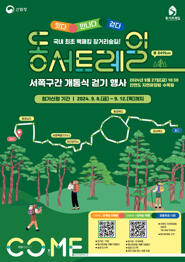 산림청이 이번 달 27일 충청남도 태안군에서 개최되는 ‘동서트레일 서쪽구간 숲길 걷기행사’ 참가자를 모집한다고 밝혔다.