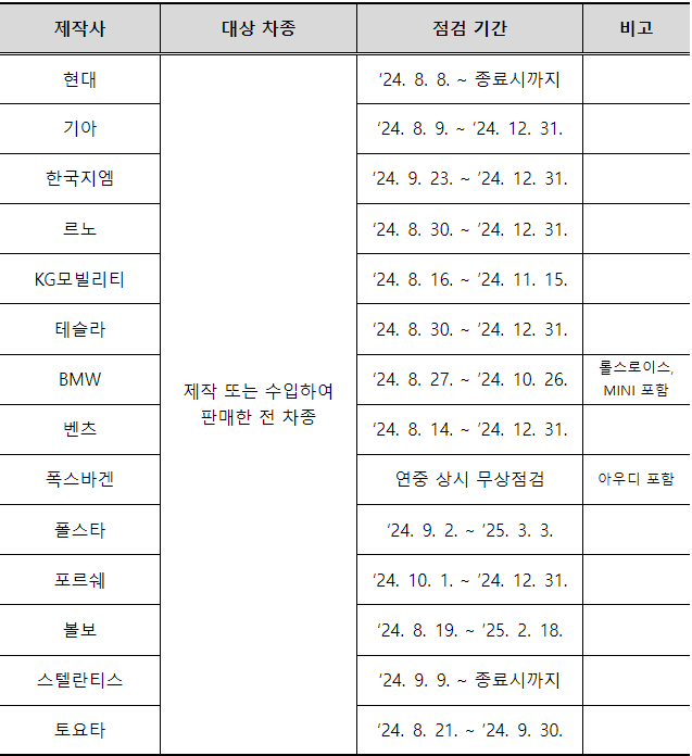 이번 특별안전점검은 지난달 8일부터 현대, 기아 등 국산 전기차 제작사를 비롯하여, 벤츠, 테슬라, BMW, GM, 폴스타, 포르쉐, 스텔란티스, 토요타 등 국내에서 판매 중인 수입 전기차 제작사 총 14개사가 자발적으로 참여하고 있다.