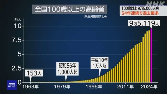 일본에서 100세 이상 인구는 1998년 처음으로 1만 명을 돌파했고, 2012년 5만 명을 넘어섰으며, 올해까지 54년 연속 늘고 있다.