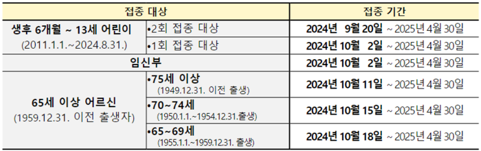 2회 접종 대상 어린이(과거 접종력이 없거나, 기존에 1회만 접종받은 6개월 이상 9세 미만 어린이)는 20일부터 시작되며, 이후 1회 접종 대상 어린이(2회 접종 대상 외 6개월 이상 13세 어린이)와 임신부는 10월 2일에 시작한다.