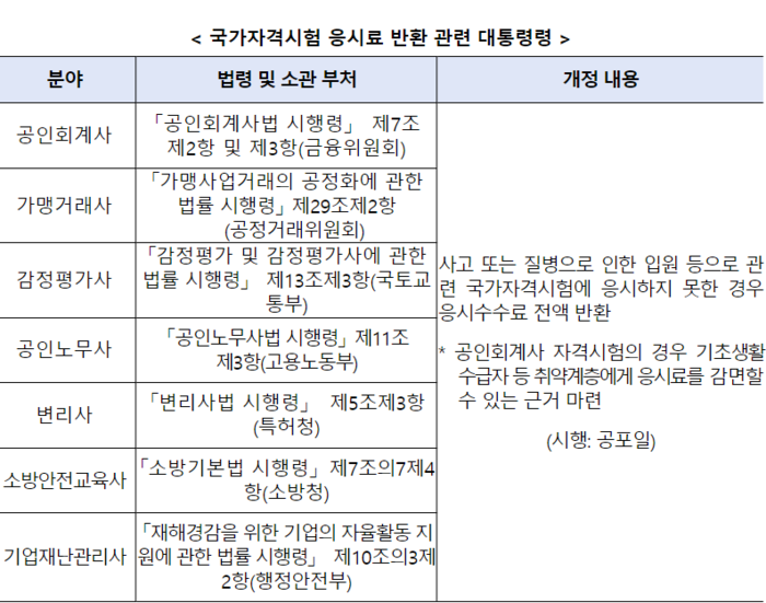 이번 개정으로 공인회계사, 가맹거래사, 공인노무사, 감정평가사 등 7개 분야의 국가자격시험에 응시하려는 사람이 사고 또는 질병으로 입원하여 시험에 응시하지 못하거나 감염병으로 격리되어 응시하지 못하는 경우 등에는 납부한 응시료 전액을 반환하는 규정이 신설된다.