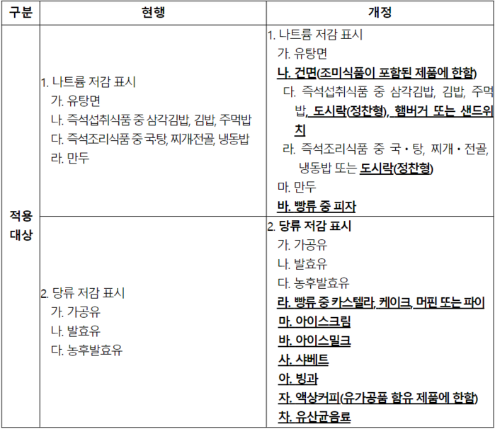 | ▲나트륨·당류 저감 표시 추가 대상 개정안 / 자료제공=식품의약품안전처 |