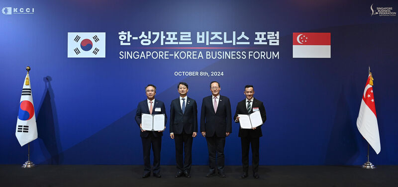 ▲대한전선이 한-싱가포르 포럼에서 MOU를 체결했다(왼쪽부터 송종민 대한전선 부회장, 안덕근 산업통상자원부 장관, 탄 시 렝 통상산업부 제2장관 겸 인력부 장관, MEO社의 CEO 대런 앙) / 사진=대한전선 제공