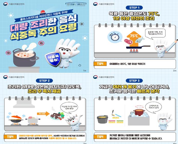 식약처는 “식중독 예방을 위해 가정에서도 손 씻기 등 개인 위생관리를 철저히 하고 칼, 도마 등 조리도구는 교차오염을 방지하기 위해 육류, 생선, 채소·과일 등 식재료별로 구분해 사용하는 등 식중독 예방수칙을 준수하는 것이 중요하다”고 강조했다.