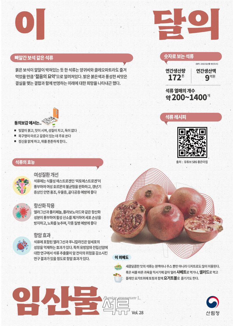 임상섭 산림청장은 “석류가 알알이 빨갛게 익어가는 계절, 맛좋고 품질좋은 국산석류로 건강을 채워보시길 바란다”고 말했다.
