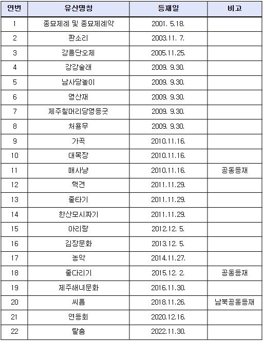 현재 한국은 22개 종목의 인류무형유산을 보유하고 있으며, ‘한국의 장 담그기 문화’가 최종 등재되면 총 23개 종목의 인류무형유산을 보유하게 된다.