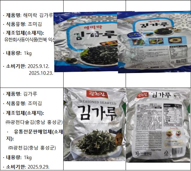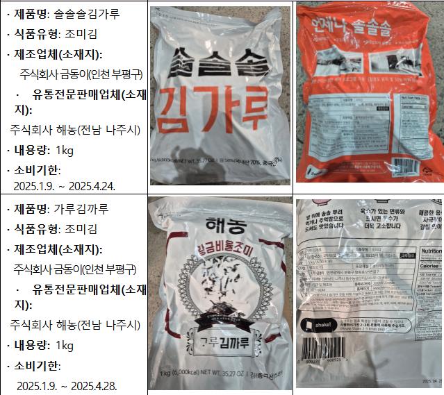 회수 대상은 수입산 단김을 원료로 제조한 금동이의 솔솔솔김가루와 가루김까루, 동이식품의 해미락 김가루, 광천다솔김이 제조한 김가루 등 4개 제품이다.