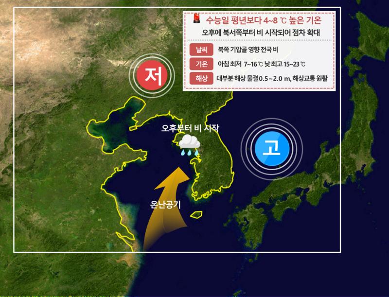기상청은 수능일 전후 기간(11~15일) 동안 아침 최저 기온은 5~10도 내외, 낮 최고 기온은 15~20도 내외로 평년보다 기온이 높을 것으로 예상했다.