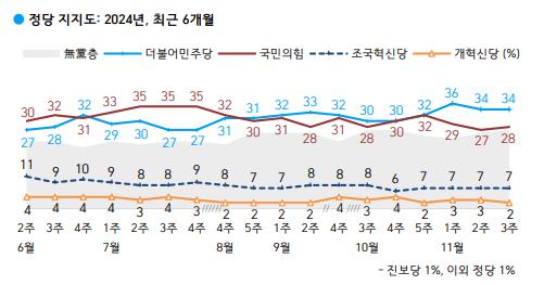 정당 지지율 조사 결과에서는 국민의힘이 28%, 더불어민주당 34%, 조국혁신당 7%, 개혁신당 2% 등 순이었고, 지지하는 정당이 없는 무당층은 27%로 나타났다.