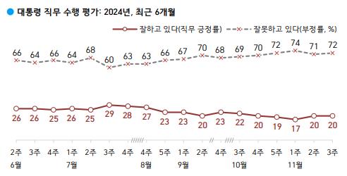 한국갤럽이 지난 19~21일 전국 성인 1001명을 대상으로 실시한 11월 3주차 여론조사 결과에 따르면 윤 대통령 국정 수행 긍정 평가율은 지난주와 같은 20%로 나타났다. 같은 기간 부정 평가는 1%포인트 오른 72%를 기록했다.