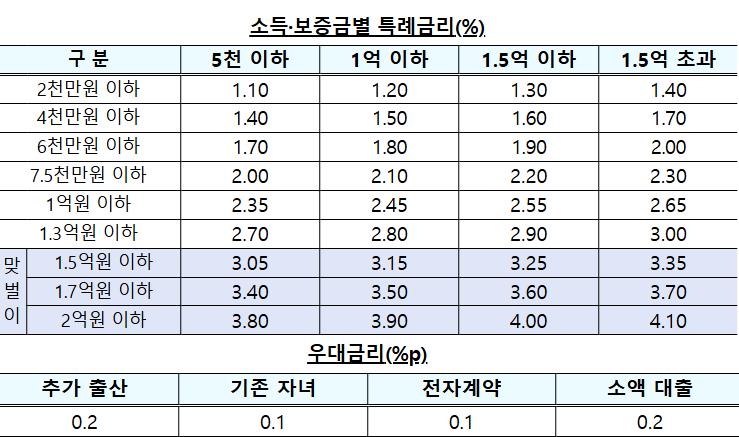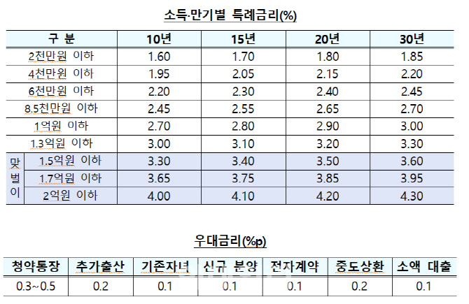 구입자금 대출은 소득과 만기에 따라 3.30~4.30%, 전세자금 대출은 소득과 보증금 수준에 따라 3.05~4.10%의 기본 금리로 제공되며, 청약저축 납입 기간, 자녀 수 등에 따른 우대금리 혜택이 부여된다.