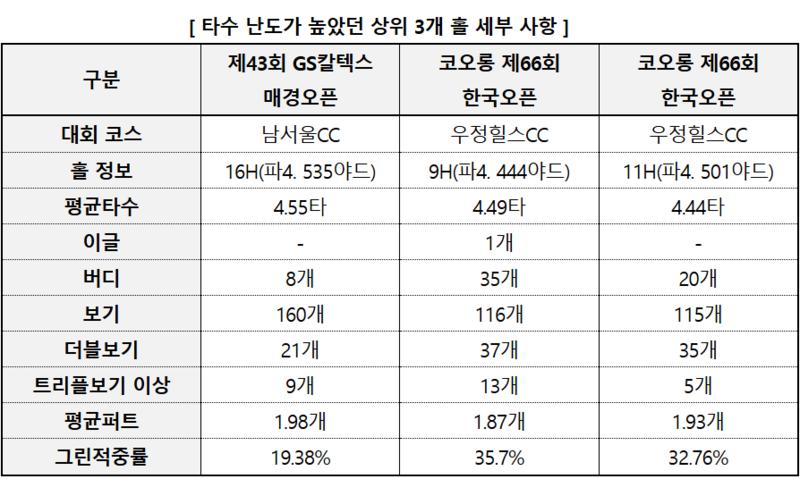 자료제공=KPGA반면 가장 쉬웠던 홀은 ‘골프존-도레이 오픈’이 열렸던 골프존카운티 선산의 9번홀(파5. 547야드)로 평균타수는 4.28타였다. 나흘간 선수들이 만든 이글은 27개, 버디는 255개였다.