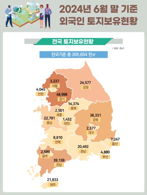 통계 자료에 따르면 먼저 외국인이 보유한 국내 토지면적은 26만5654천㎡로, 전체 국토면적의 0.26% 수준인 것으로 나타났다.
