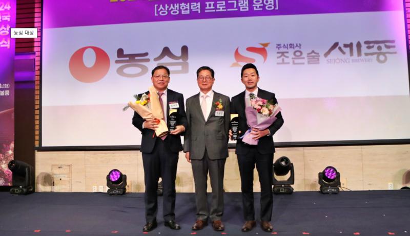 농심이 '2024년 대한민국 동반성장 대상'에서 상생협력 프로그램 운영부문 대상을 수상한 후 기념촬영을 하고 있다-왼쪽부터 김보규 농심 상무, 이달곤 동반성장위원회 위원장, 경기용 조은술세종 부사장 / 사진=농심 제공농심이 지난 10일 동반성장위원회가 주최한 ‘2024년 대한민국 동반성장 대상’에서 상생협력 프로그램 운영 부문 대상을 수상했다.