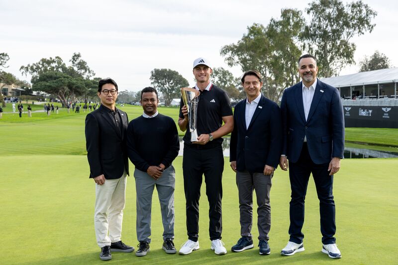 왼쪽부터 제네시스사업본부장 송민규 부사장, 테드 멘지스테 제네시스 북미법인 최고운영책임자(COO), ‘2025 제네시스 인비테이셔널’ 우승자 루드비그 오베리, 현대차 호세 무뇨스 대표이사 사장, 현대차 랜디 파커 북미법인 최고경영자(CEO)가 기념 촬영을 하고 있다 / 사진=현대자동차 제공