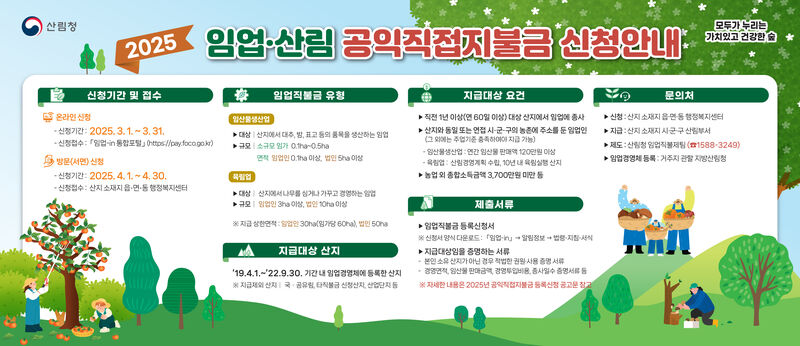 중부지방산림청이 올해 임업, 산림 공익직접지불금(이하 임업직불금) 신청접수를 3월 1일부터 4월 30일까지 실시한다고 밝혔다.