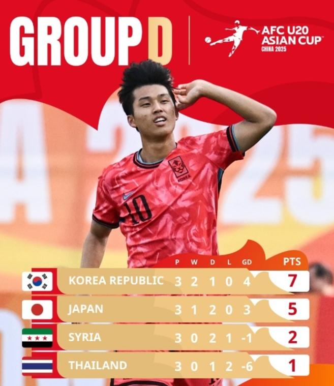 이날 무승부로 한국은 2승1무 승점 7을 기록하며, D조 1위로 AFC U-20 아시안컵 8강 진출에 성공했다.
