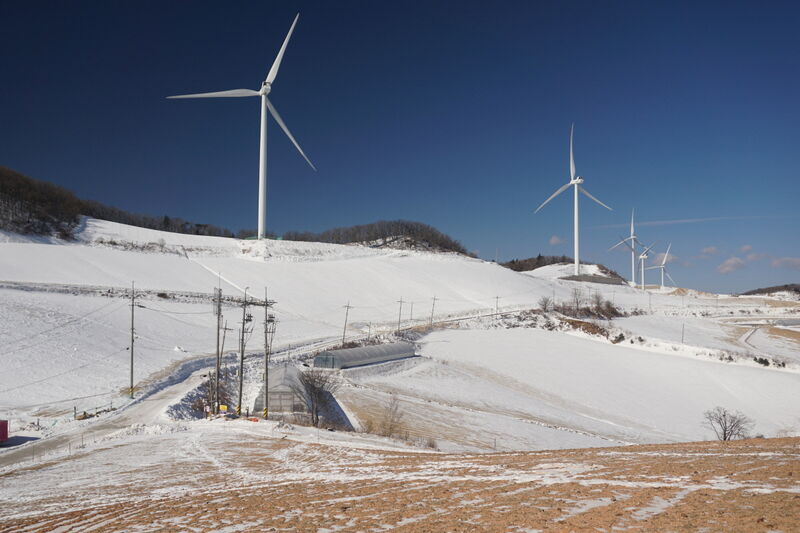 산능선에 세워진 울타리와 설원이 어우러진 풍경