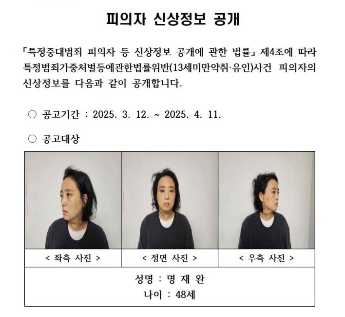 대전경찰청은 12일 오전, 명 씨의 이름, 나이, 얼굴 사진 등을 공개하며, 명 씨가 특정 범죄 가중 처벌 등에 관한 법률 위반(13세 미만 약취 및 유인) 등의 혐의를 받는다고 밝혔다.
