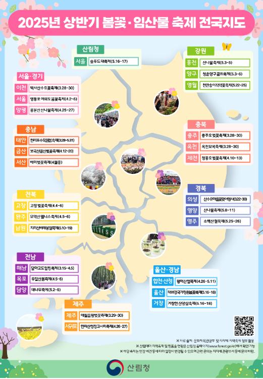 산림청이 전국의 산림 관련 축제를 한눈에 볼 수 있는 2025년 상반기 ‘봄꽃·임산물 축제 전국지도’를 발간했다고 14일 밝혔다.