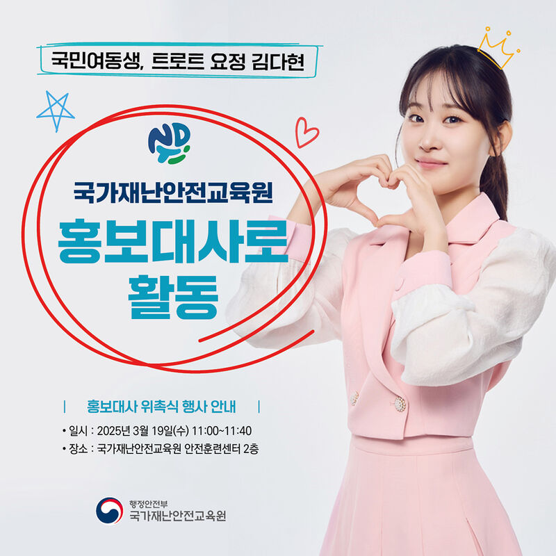 김다현은 친근한 이미지와 뛰어난 가창력으로 대중에게 많은 사랑을 받고 있는 가수다. 앞으로 그는 국가재난안전교육원 홍보대사로서 재난안전교육의 중요성을 널리 알리는 다양한 홍보 활동에 참여할 예정이다.
