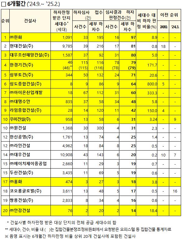 국토교통부가 하자심사분쟁조정위원회(이하 "하심위")에 접수된 공동주택 하자 처리 현황과 2025년 상반기(4차) 하자 판정 결과 상위 건설사 명단을 공개했다. 이번 발표는 2023년 9월 1차 공개를 시작으로 지난해 3월과 10월 이후 네 번째다.