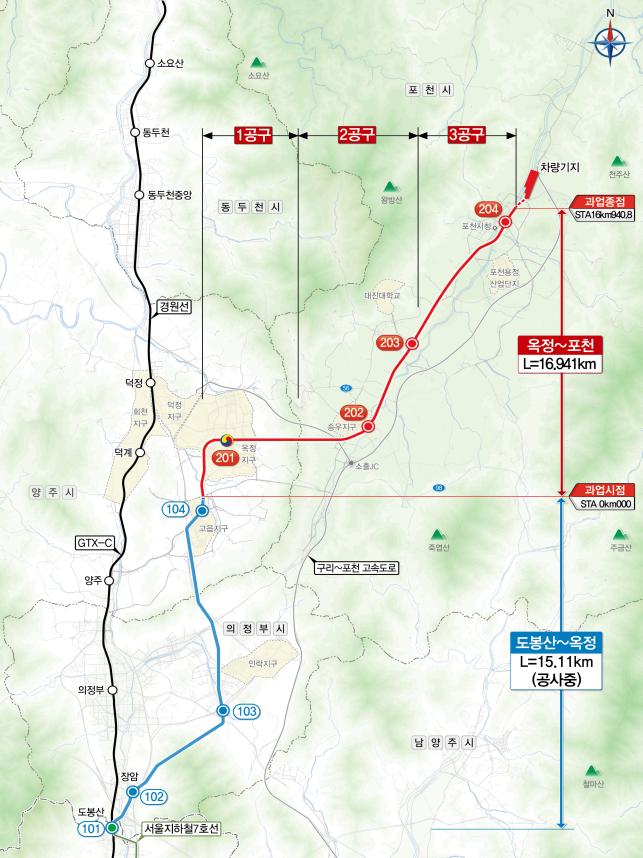 구간별로는 1공구(양주 고읍율정, 4.9km), 2공구(양주 율정포천 선단, 6.3km), 3공구(포천 선단~군내, 5.8km)로 나뉘어 진행된다.