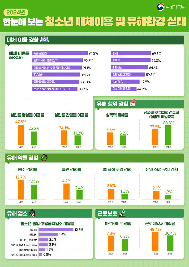 최근 1년간 청소년들의 ‘성인용 영상물’ 이용률은 26.5%로, 2022년(47.5%) 대비 21.0%p 감소했다. ‘성인용 간행물’ 이용률도 11.2%로 지속적인 감소세(2020년 24.9% → 2022년 24.1% → 2024년 11.2%)를 보였다.