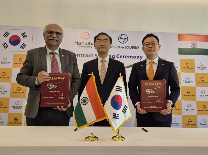 계약 체결식은 이날 인도 뉴델리 주재 한국대사관에서 진행됐다. 이 행사에는 이성호 주인도 한국대사, 손재일 한화에어로스페이스 대표이사, 아룬 람찬다니 L&T 수석 부사장 등이 참석해 계약식을 체결했다.