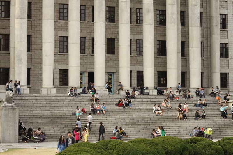 본관 중앙계단에서 한가로운 시간을 갖는 학생들