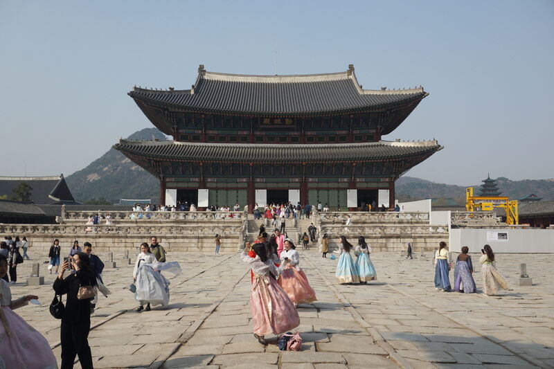 지하철 3호선 경복궁역 3번 출구와 4번 출구 사이 지상을 잇는 엘리베이터를 이용하면 경복궁을 찾는 발길이 한층 편해 노약자를 동반한 나들이에 편리하다. 광화문을 들어서거나, 경복궁 서쪽 문을 들어서면 드넓은 경복궁 뜨락에 꽃구름이 두둥실 눈높이로 떠다닌다. 언제부터인가 외국인들 사이, 인근 대여점에서 한복을 갖춰 입고 고궁 나들이하는 관광객들로 보는 눈이 벌써부터 화사하다. 경복궁의 서쪽 뜨락 은행나무 아래 벤치에 앉아 한가로이 여유를 즐기는 것도 좋지만, 이왕이면 매표소에 표를 끊고 흥례문 안으로 들어가 보자.