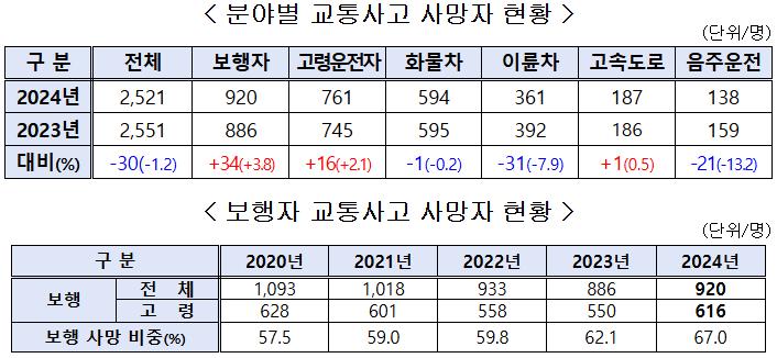 반면, 보행자 교통사고 사망자는 920명으로 전년 대비 3.8%(34명) 증가했다. 이 중 65세 이상 고령자 비중은 67.0%(616명)로, 전년도 62.1%(550명)에서 크게 늘어난 것으로 나타났다. 경찰은 인구 고령화가 영향을 준 것으로 보고 있다.
