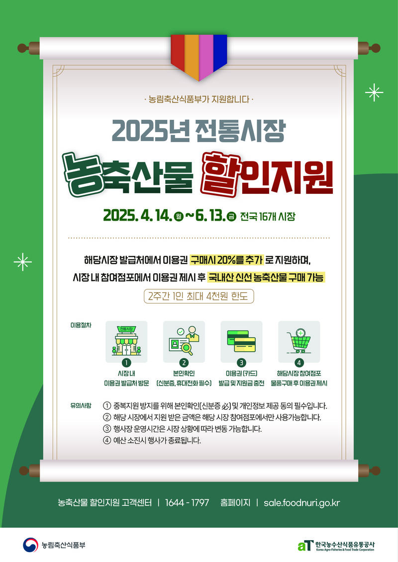 농림축산식품부가 전통시장 이용 소비자의 장바구니 부담을 덜기 위해 오는 4월 14일부터 6월 13일까지 2개월간 전국 16개 전통시장에서 ‘전통시장 농축산물 상시 할인지원 시범사업’을 실시한다고 밝혔다.