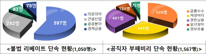 세부 분야별로 보면, 불법 리베이트 단속에서는 의료‧의약 분야가 597명(구속 5명)으로 가장 많았고, 이어 건설산업 292명(구속 4명), 공공분야 83명, 경제‧금융 분야 78명(구속 7명)이 뒤를 이었다.