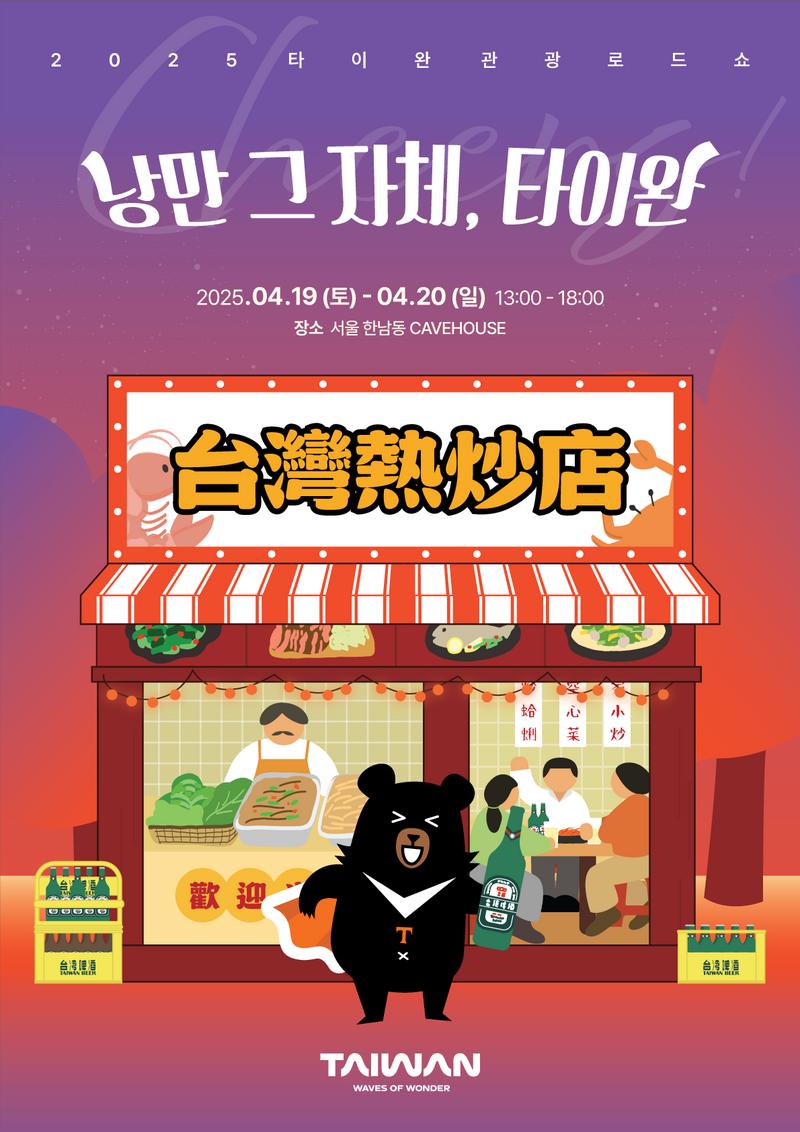 2025타이완관광로드쇼 - Cheers! 낭만 그 자체, 타이완!’ 포스터 이번 팝업 행사는 타이완의 대표 길거리 미식 문화인 ‘러차오(100원 포차)’를 콘셉트로 구성돼, 현장을 찾은 관람객들에게 마치 타이완 현지를 여행하는 듯한 감각적인 경험을 선사할 예정이다.