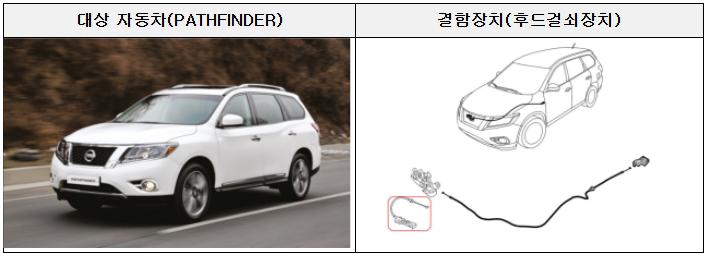 한국닛산은 PATHFINDER 591대에서 후드걸쇠장치가 부식되어 주행 중 후드가 경고 없이 열릴 가능성이 있어 4월 1일부터 시정조치를 시행하고 있다.