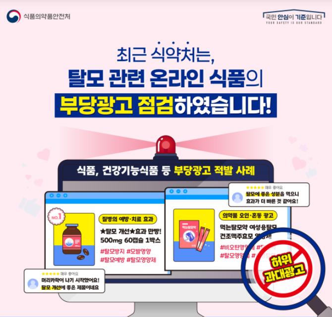 주요 사례로는 식품을 ‘탈모 예방’이나 ‘먹는 탈모약’으로 소개해 의약품으로 오해하게 하거나, 질병 치료에 효과가 있는 것처럼 표현한 광고가 있었다.