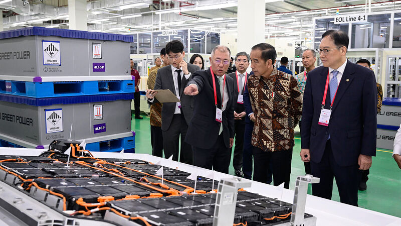 지난해 7월 정의선 현대차그룹 회장이 조코 위도도 인도네시아 대통령과 배터리셀 합작공장 HLI그린파워를 둘러보고 있다/사진=현대자동차 제공