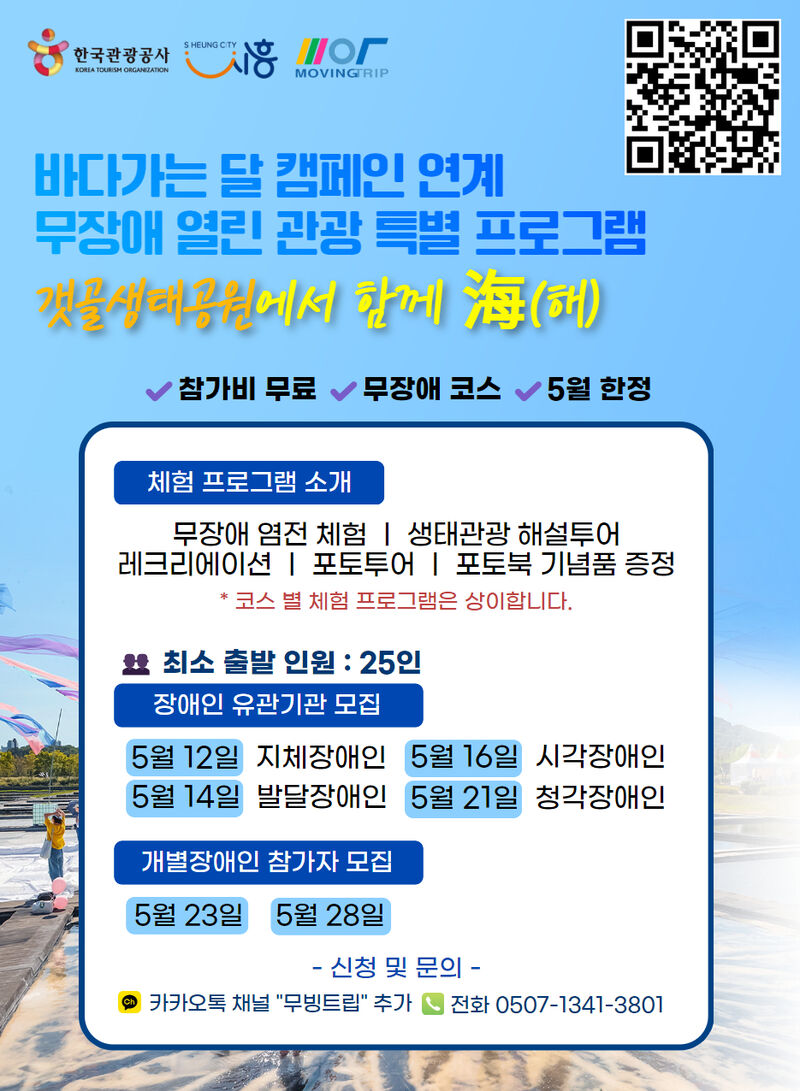 무장애 여행 전문 여행사 무빙트립이 한국관광공사 경인지사, 경기도 시흥시와 손잡고 5월 ‘바다 가는 달’ 캠페인과 연계한 무장애 열린 관광 특별 프로그램 ‘갯골생태공원에서 함께 海(해)’를 선보인다.