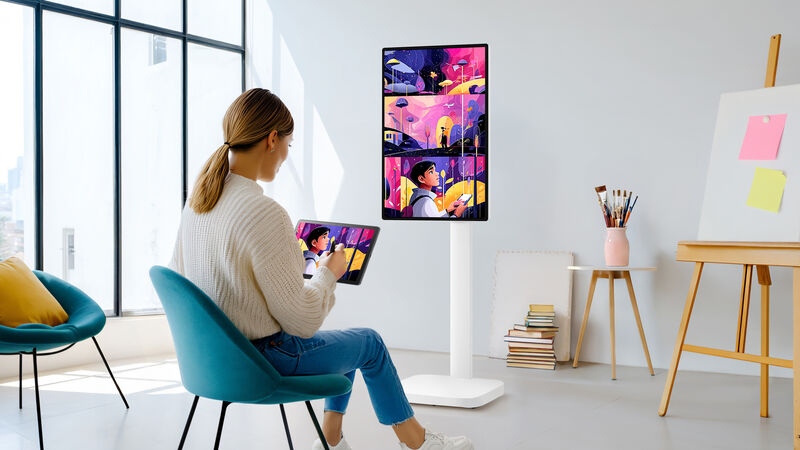 스탠드는 틸트, 스위블, 피벗 기능은 물론, 5개의 바퀴로 실내 어디서든 쉽게 이동할 수 있어 홈오피스는 물론 교육, 매장, 엔터테인먼트 환경까지 폭넓게 활용 가능하다.