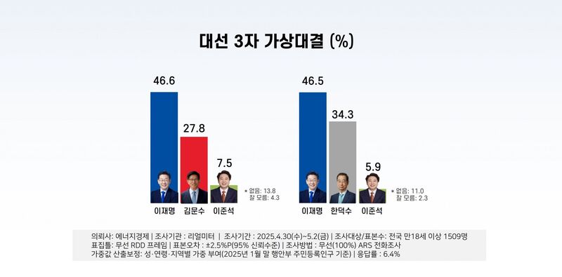 여론조사기관 리얼미터가 에너지경제신문 의뢰로 지난달 30일부터 이달 2일까지 전국 만 18세 이상 유권자 1509명을 대상으로 실시한 조사에 따르면, 이재명 후보는 김문수(국민의힘), 이준석(개혁신당) 후보와의 3자 가상 대결에서 46.6%를 기록해 27.8%를 얻은 김문수 후보를 18.8%포인트 차로 앞섰다. 이준석 후보는 7.5%였다.