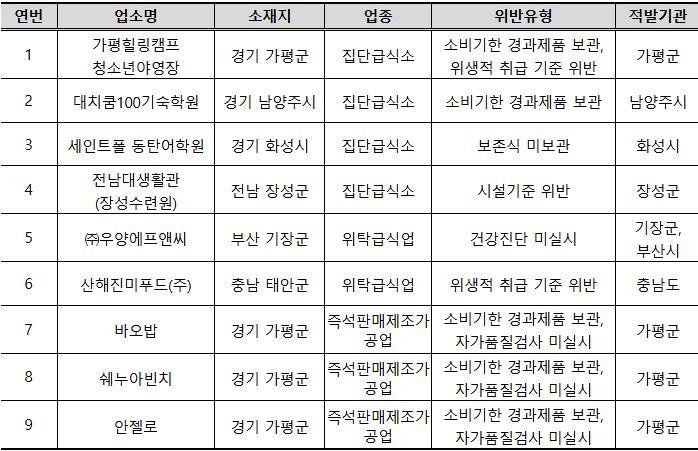 적발된 위반 사례는 ▲소비기한이 지난 식품 보관 ▲자가품질검사 미실시 ▲위생적 취급 기준 위반 ▲종사자 건강진단 미실시 ▲보존식 미보관 ▲시설기준 미달 등으로 나타났다.