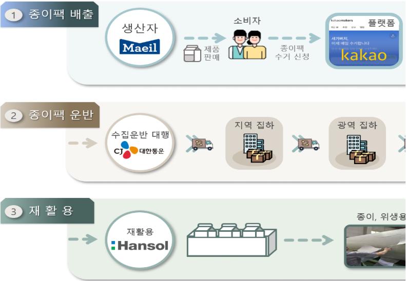 회수 참여자에게는 매일유업이 자사 제품 할인쿠폰을 제공해 참여를 유도하고, 회수된 종이팩은 한솔제지가 고품질 화장지나 포장용지 등으로 재활용하게 된다. 이를 통해 종이팩의 비대면·온라인 회수 체계를 구축하고, 소비자 참여를 기반으로 한 순환경제 모델의 기반을 다질 계획이다.