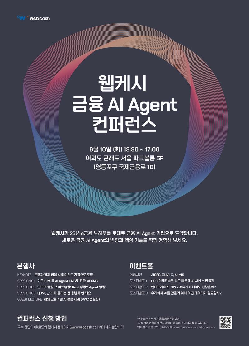 ‘금융 AI Agent 컨퍼런스’는 6월 10일 오후 1시 30분부터 5시까지 여의도 콘래드 서울 파크볼룸 5층에서 개최되며, 참가 신청은 웹케시 공식 홈페이지 또는 행사 포스터의 QR 코드를 통해 가능하다.
