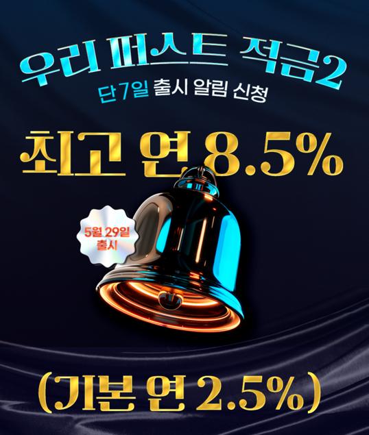 우리은행은 오는 5월 29일, 최고 연 8.5% 금리를 제공하는 ‘우리 퍼스트 적금 2’를 출시한다고 22일 밝혔다.