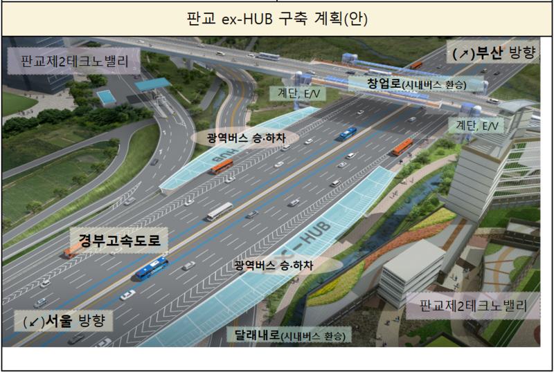 ‘ex-HUB’는 고속도로(expressway)와 교통의 중심지(HUB)를 결합한 개념으로, 고속도로 본선에 광역버스 정류장과 환승 공간, 승하차 지원시설(엘리베이터 등), 판교 제2테크노밸리와의 연결 보도 등을 설치하는 사업이다.